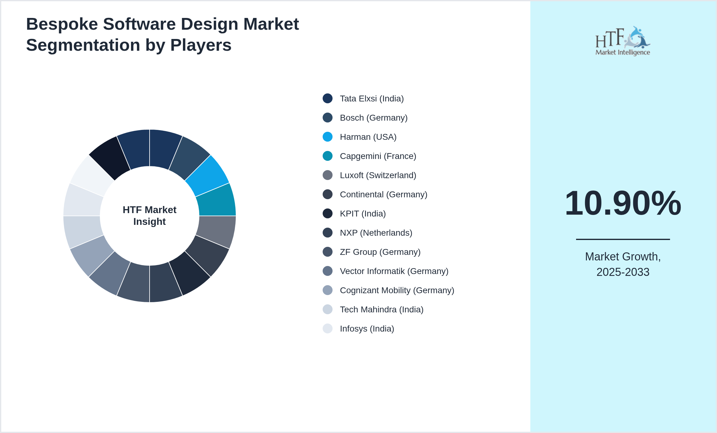 | Companies Covered | Tata Elxsi (India), Bosch (Germany), Harman (USA), Capgemini (France), Luxoft (Switzerland), Continental (Germany), KPIT (India), NXP (Netherlands), ZF Group (Germany), Vector Informatik (Germany), Cognizant Mobility (Germany), Tech Mahindra (India), Infosys (India), Siemens (Germany), Panasonic Automotive (Japan), Renault Software Labs (France) |